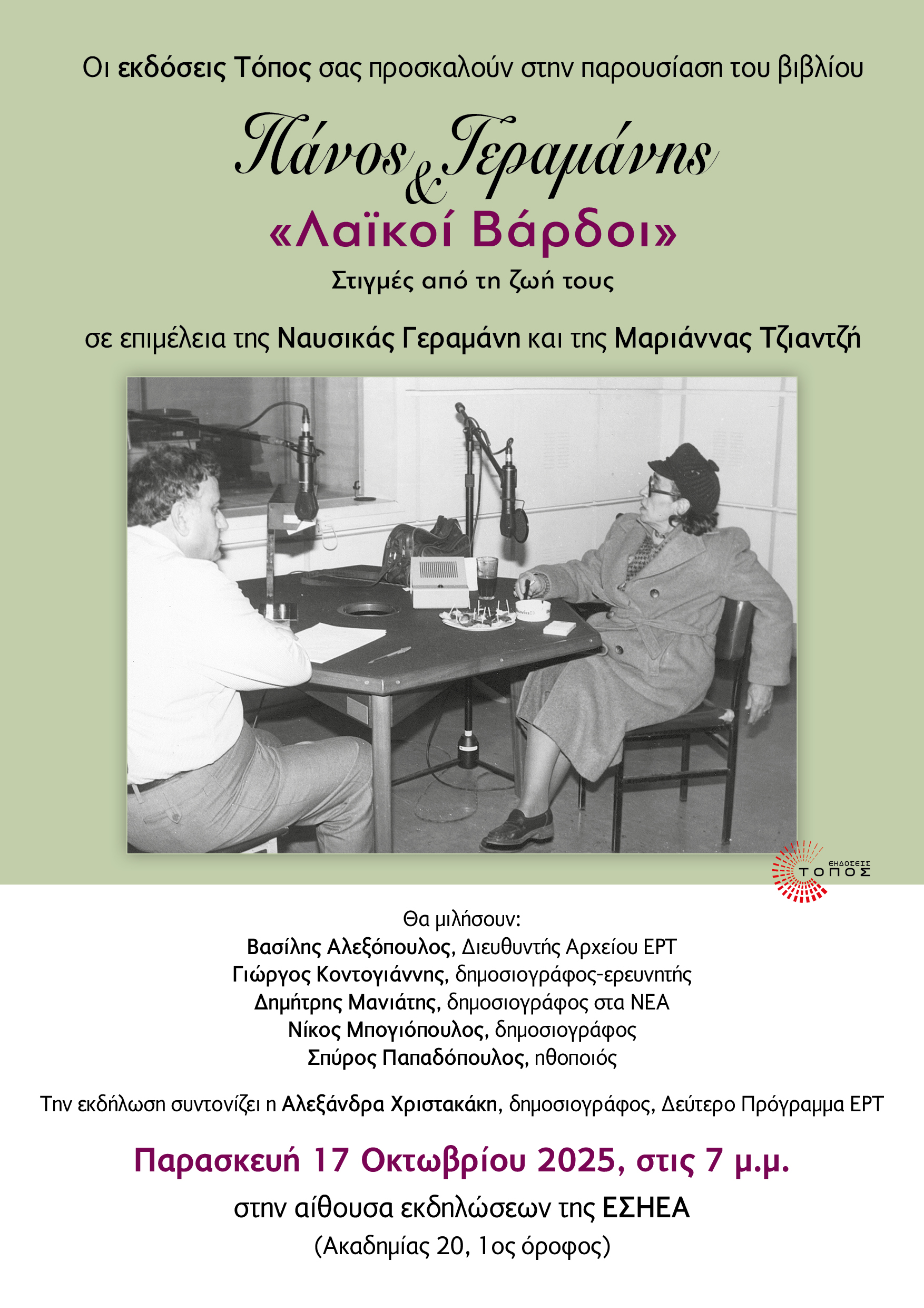 ::. Παρασκευή 17 Οκτωβρίου, ΕΣΗΕΑ: "Πάνος Γεραμάνης και «Λαϊκοί βάρδοι»" παρουσίαση του βιβλίου της Ναυσικάς Γεραµάνη & της Μαριάννας Τζιαντζή (08-10-2025 12:09)