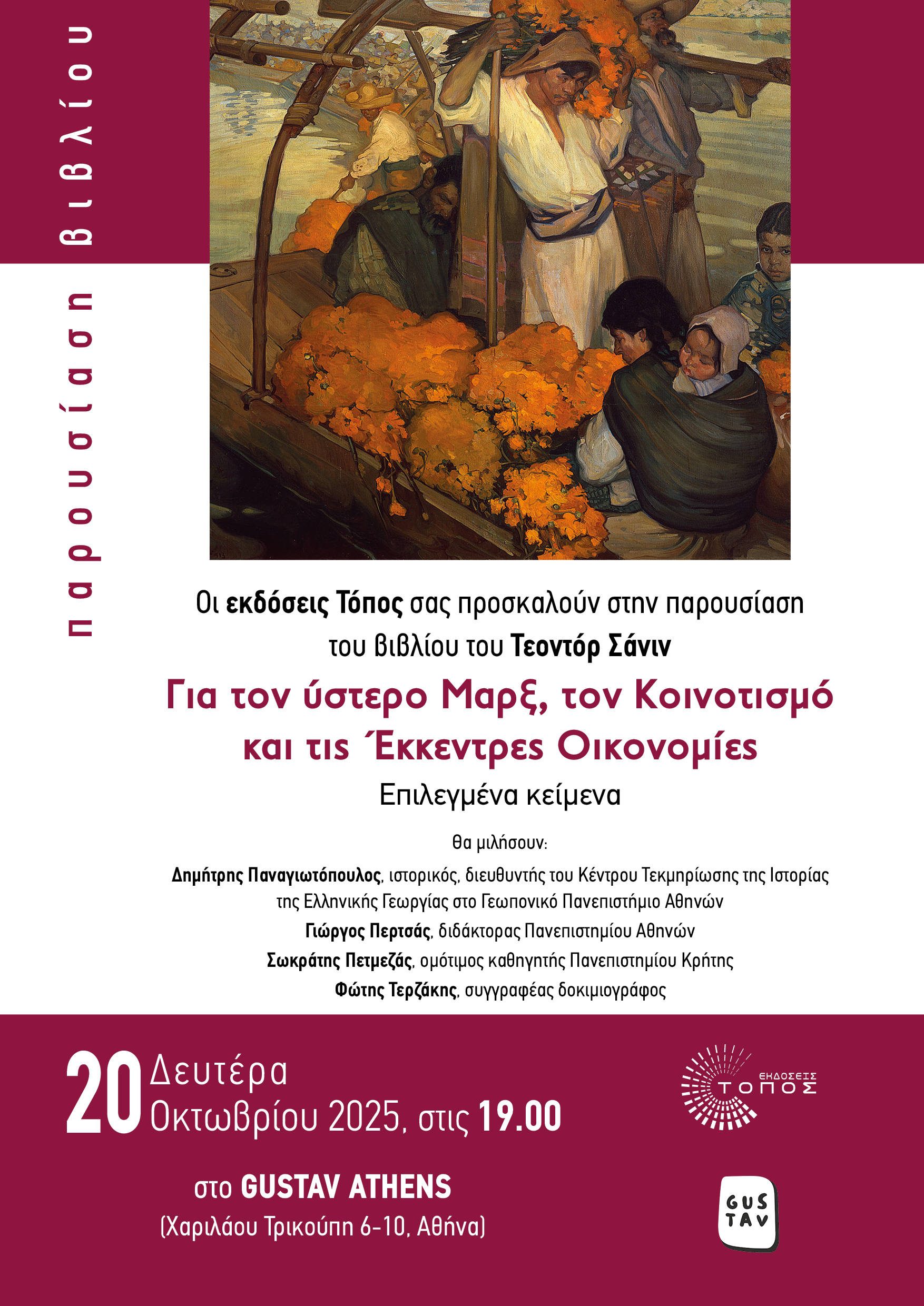 ::. Δευτέρα 20 Οκτωβρίου, Αθήνα: "Για τον ύστερο Μαρξ, τον Κοινοτισμό και τις Έκκεντρες Οικονομίες" παρουσίαση του βιβλίου του Τέοντορ Σάνιν (14-10-2025 13:48)