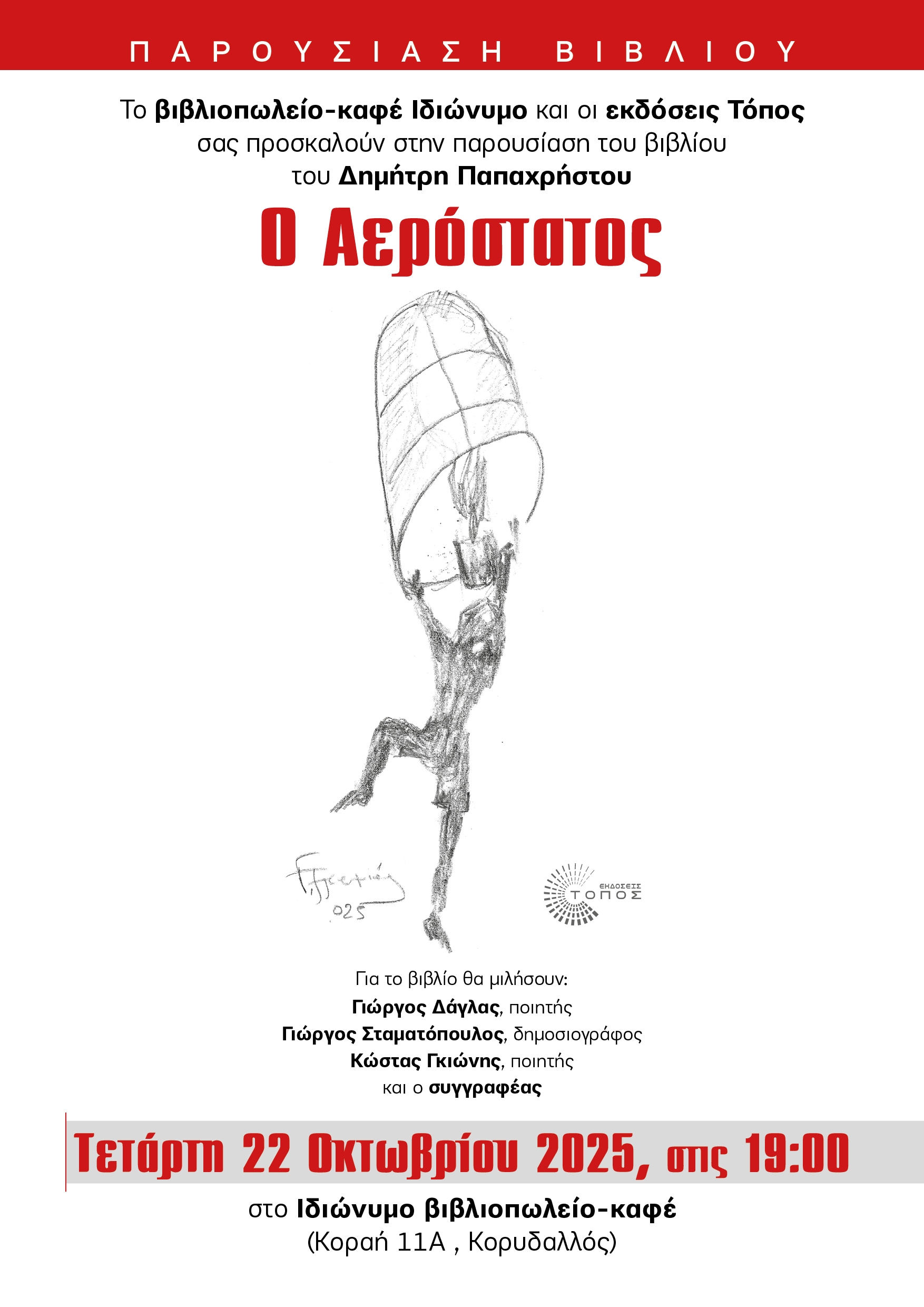 ::. Τετάρτη 22 Οκτωβρίου, Κορυδαλλός: ''Ο Αερόστατος'' παρουσίαση του βιβλίου του Δημήτρη Παπαχρήστου (15-10-2025 18:54)