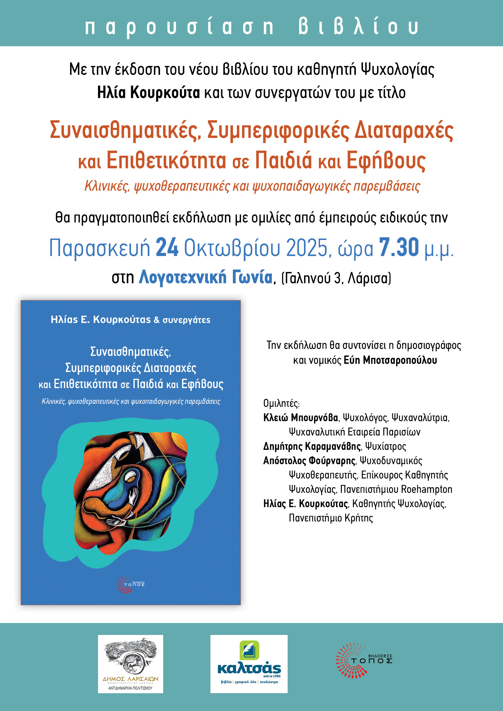 ::. Παρασκευή 24 Οκτωβρίου, Λάρισα: "Συναισθηµατικές, Συµπεριφορικές ∆ιαταραχές και Επιθετικότητα σε Παιδιά και Εφήβους" παρουσίαση του νέου βιβλίου του Ηλία Κουρκούτα (16-10-2025 10:32)