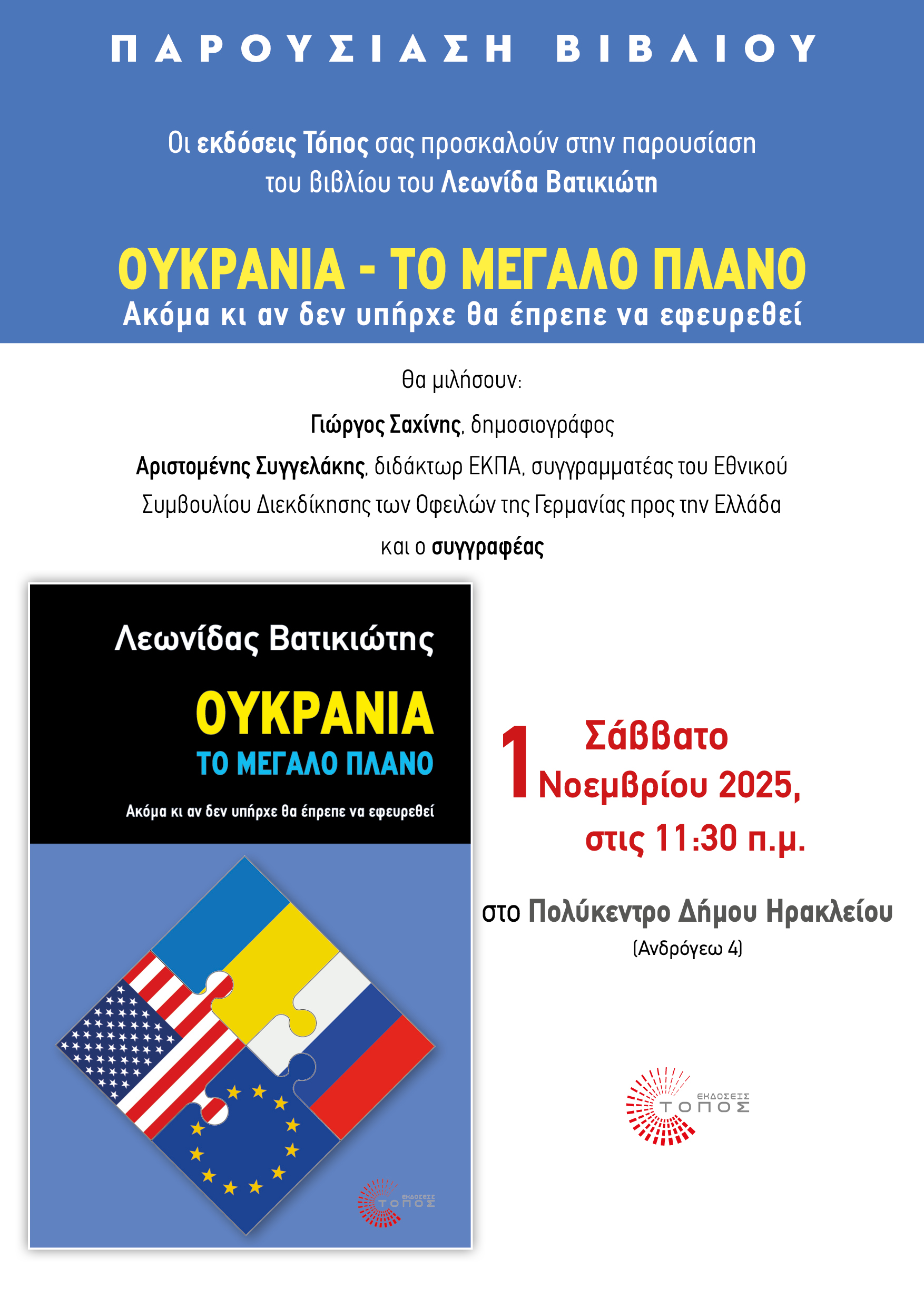 ::. Σάββατο 1 Νοεμβρίου, Ηράκλειο: ''Ουκρανία - Το μεγάλο πλάνο: Ακόμα κι αν δεν υπήρχε θα έπρεπε να εφευρεθεί'' παρουσίαση του βιβλίου του Λεωνίδα Βατικιώτη (21-10-2025 11:41)