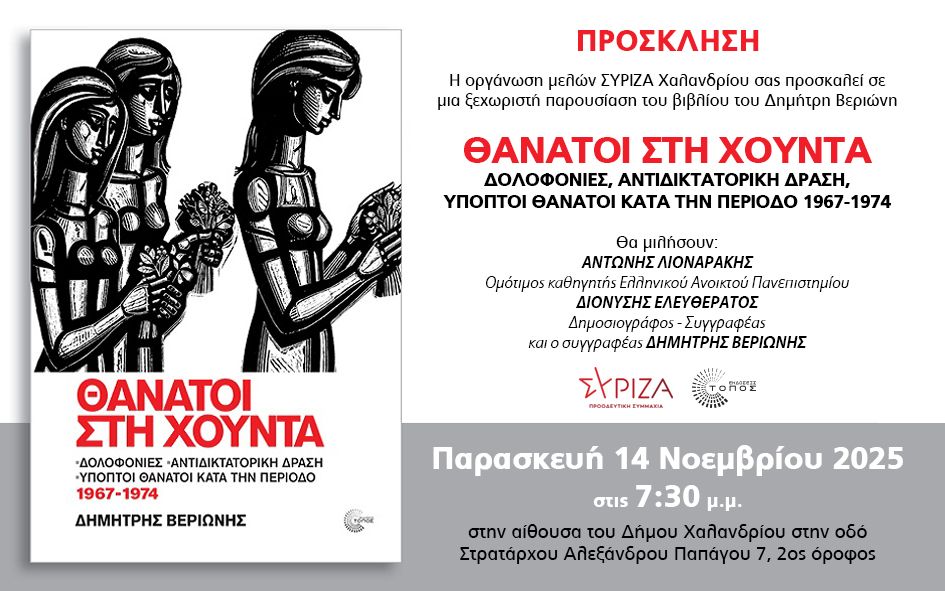 ::. Παρασκευή 14 Νοεμβρίου, Χαλάνδρι: ''Θάνατοι Στη Χούντα – Δολοφονίες, αντιδικτατορική δράση, ύποπτοι θάνατοι κατά την περίοδο 1967-1974'' παρουσίαση του βιβλίου του Δημήτρη Βεριώνη (30-10-2025 11:22)