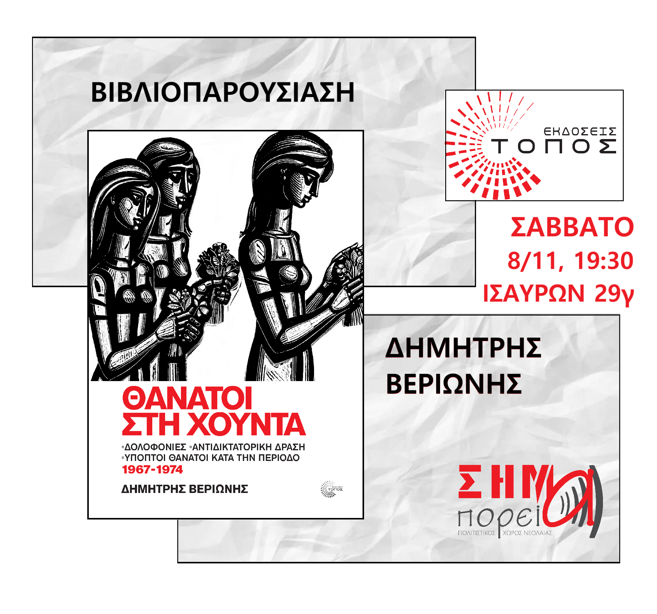 ::. Σάββατο 8 Νοεμβρίου, Αθήνα: ''Θάνατοι Στη Χούντα – Δολοφονίες, αντιδικτατορική δράση, ύποπτοι θάνατοι κατά την περίοδο 1967-1974'' παρουσίαση του βιβλίου του Δημήτρη Βεριώνη (30-10-2025 12:03)