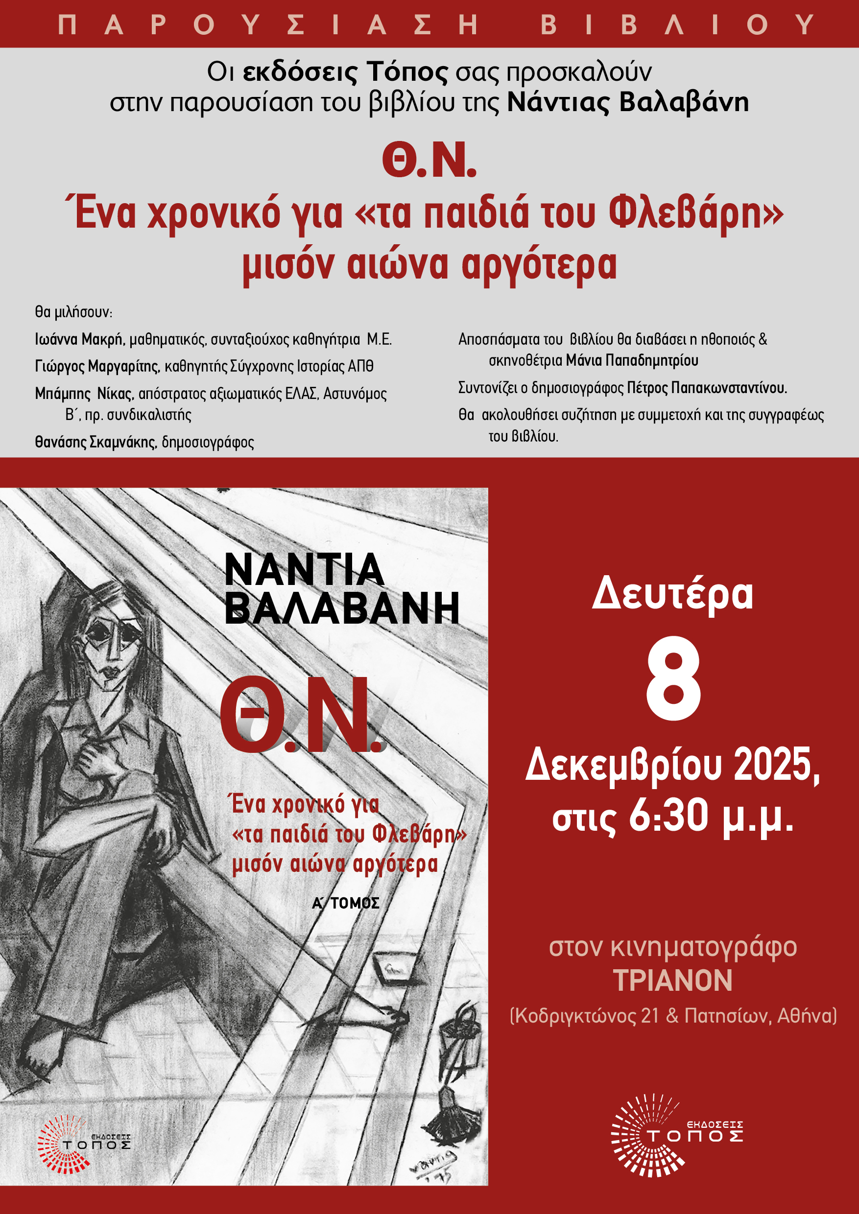 ::. Δευτέρα 8 Δεκεμβρίου, Αθήνα: "Θ.Ν. - Ένα χρονικό για «τα παιδιά του Φλεβάρη» μισόν αιώνα αργότερα" παρουσίαση του νέου βιβλίου της Νάντιας Βαλαβάνη (24-11-2025 14:30)