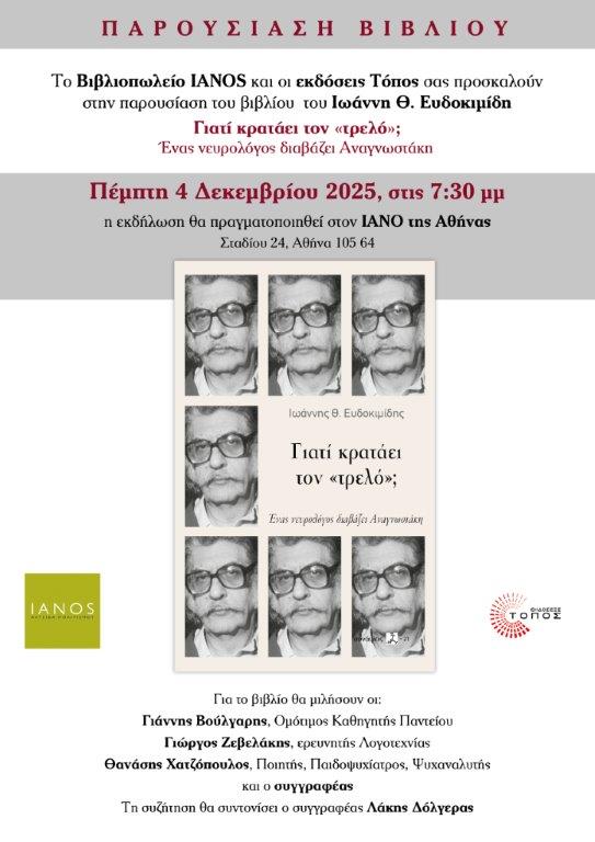 ::. ΑΚΥΡΩΣΗ ΕΚΔΗΛΩΣΗΣ-Πέμπτη 4 Δεκεμβρίου, Αθήνα: "Γιατί κρατάει τον «τρελό»; Ένας νευρολόγος διαβάζει Αναγνωστάκη" παρουσίαση του νέου βιβλίου του Ιωάννη Θ. Ευδοκιµίδη (27-11-2025 11:35)