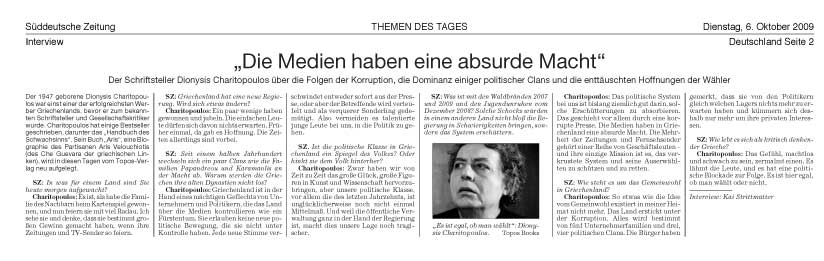 Δύο μέρες μετά τις εκλογές (και λίγες μέρες πριν την επανέκδοση της ιστορικής βιογραφίας του Άρη Βελουχιώτη Άρης, ο αρχηγός των ατάκτων ) ο Διονύσης Χαριτόπουλος έδωσε συνέντευξη στη γερμανική εφημερίδα Sueddeutsche Zeitung* επιμένοντας στο ζήτημα της κυριαρχίας των μέσων μαζικής ενημέρωσης στην Ελλάδα. Παραθέτουμε εδώ αυτούσιο το γερμανικό κείμενο και τη μετάφρασή του.