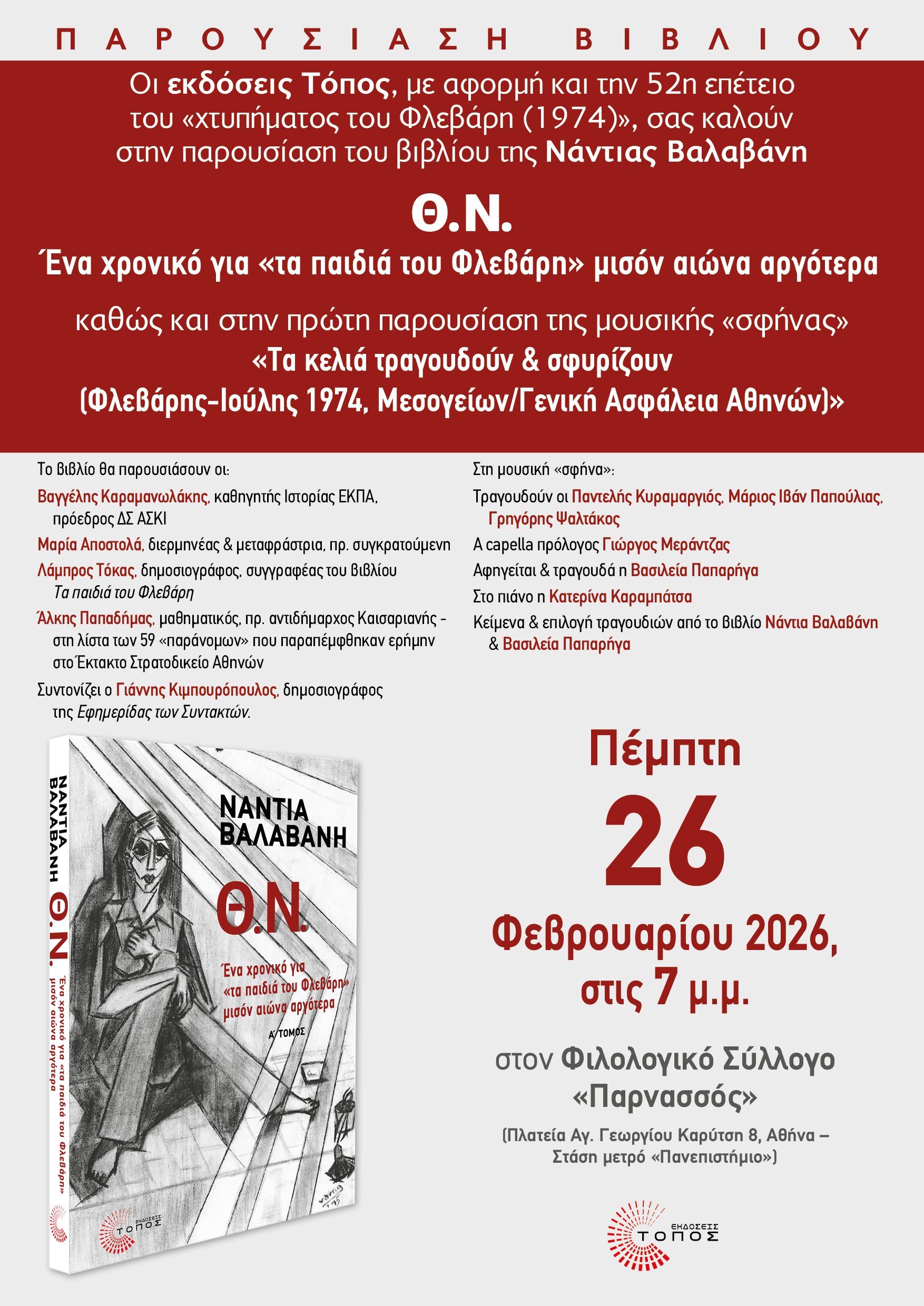 ::. Πέμπτη 26 Φεβρουαρίου, Αθήνα: "Θ.Ν. - Ένα χρονικό για «τα παιδιά του Φλεβάρη» μισόν αιώνα αργότερα" παρουσίαση του νέου βιβλίου της Νάντιας Βαλαβάνη (26-01-2026 10:31)