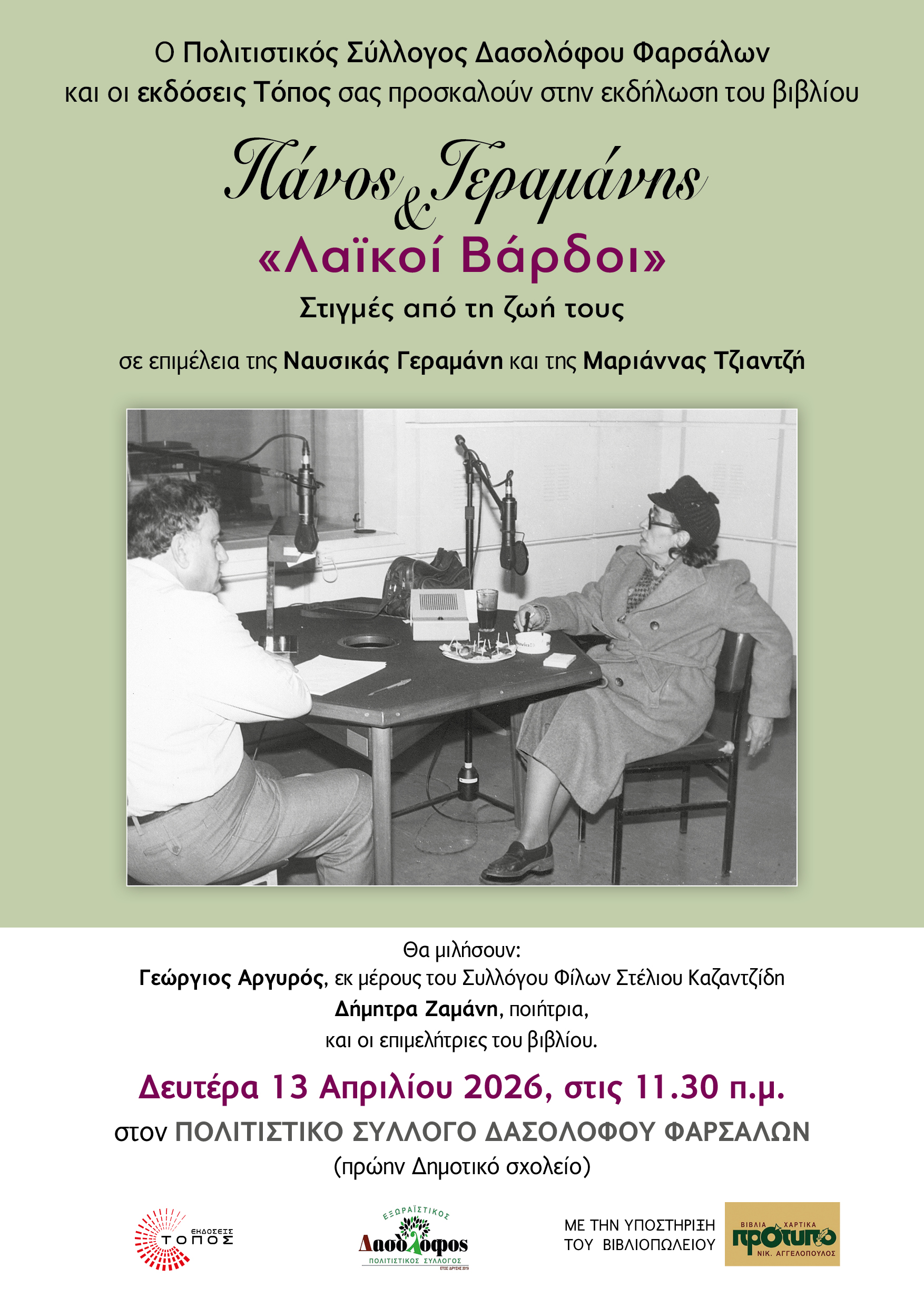 ::. Δευτέρα 13 Απριλίου, Δασόλοφος Φαρσάλων: "Πάνος Γεραμάνης και «Λαϊκοί βάρδοι»" παρουσίαση του βιβλίου της Ναυσικάς Γεραµάνη & της Μαριάννας Τζιαντζή (30-03-2026 15:48)