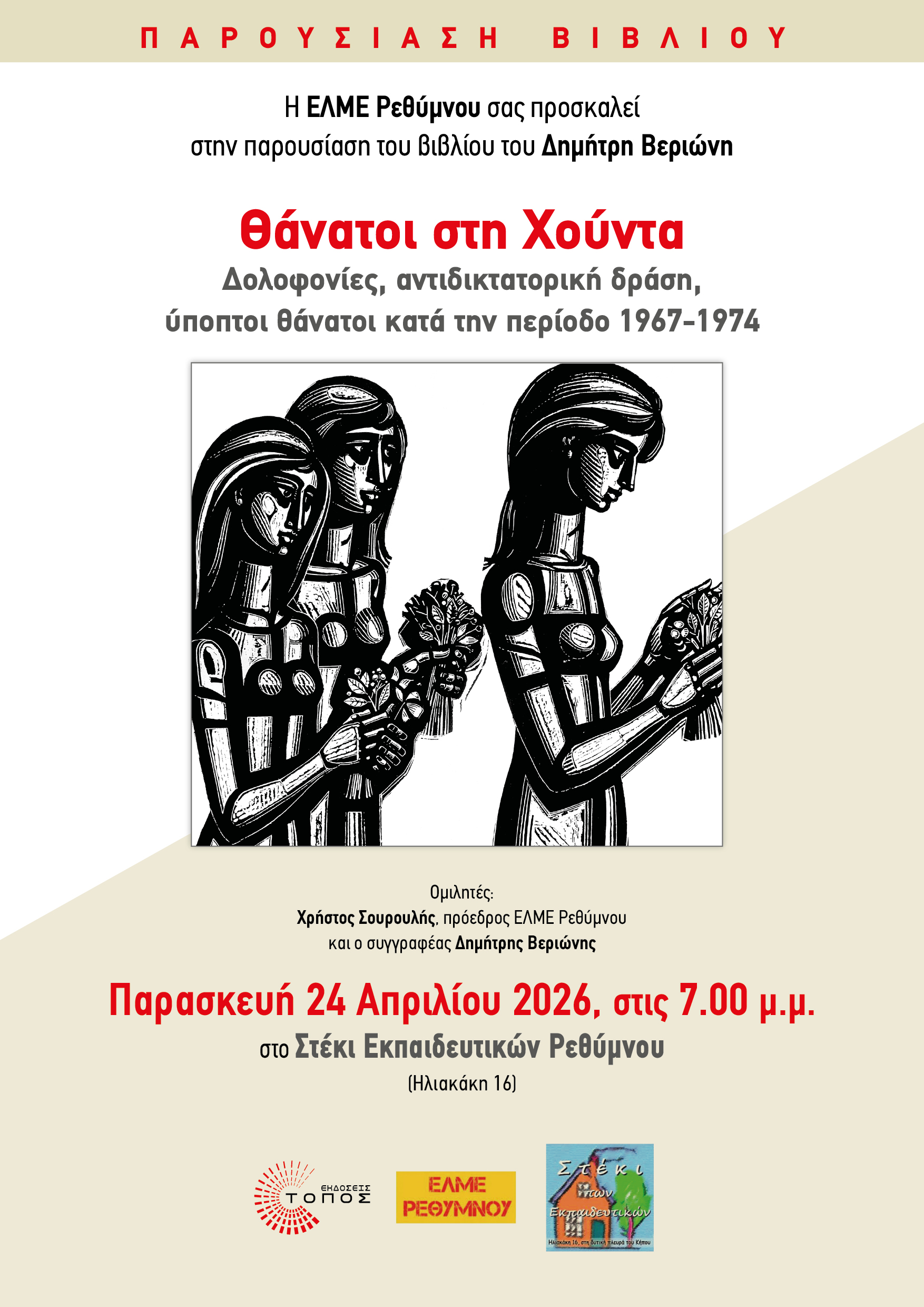 ::. Παρασκευή 24 Απριλίου, Ρέθυμνο: ''Θάνατοι Στη Χούντα – Δολοφονίες, αντιδικτατορική δράση, ύποπτοι θάνατοι κατά την περίοδο 1967-1974'' παρουσίαση του βιβλίου του Δημήτρη Βεριώνη (31-03-2026 14:54)