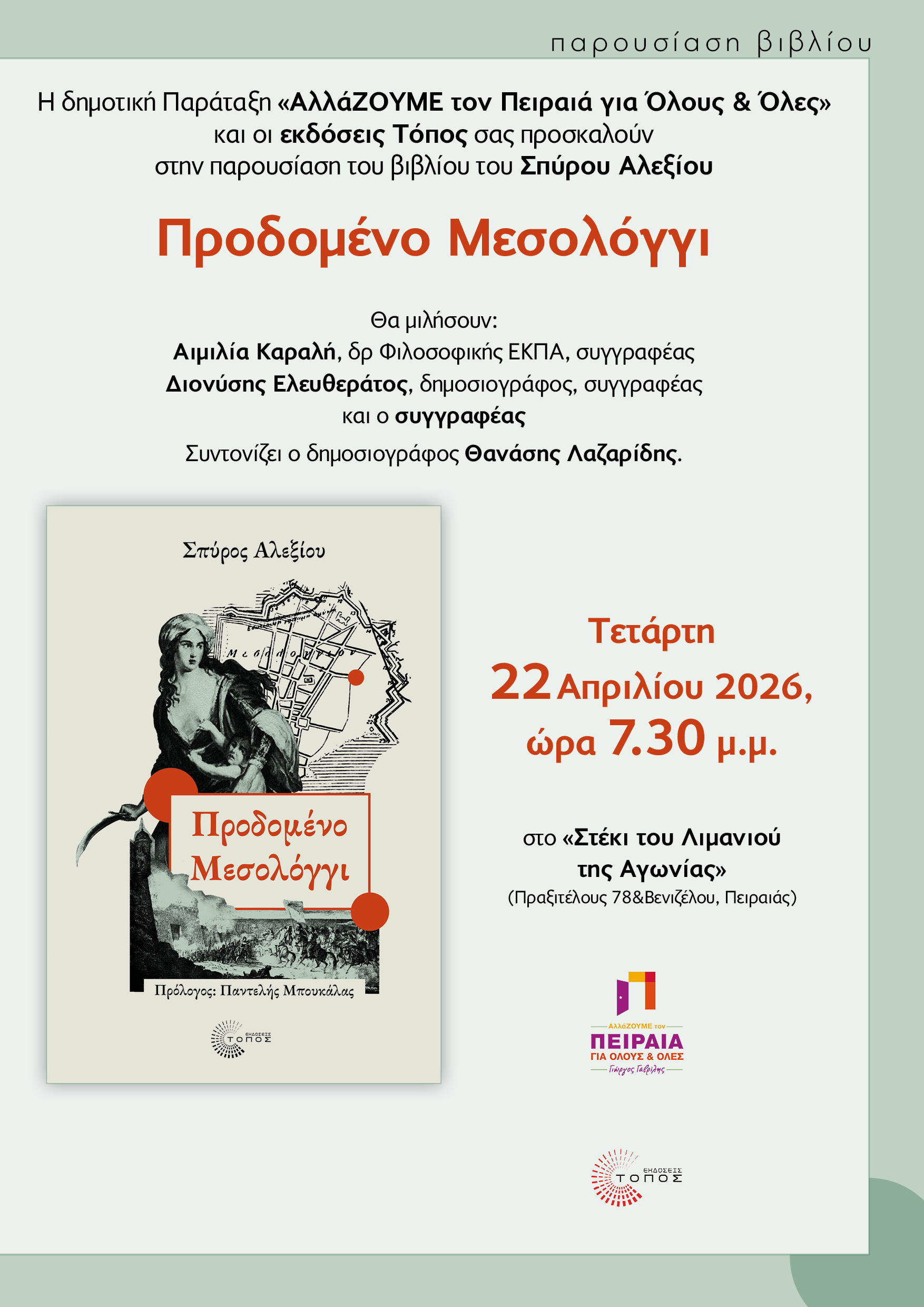 ::. Τετάρτη 22 Απριλίου, Πειραιάς: "Προδομένο Μεσολόγγι" παρουσίαση του νέου βιβλίου του Σπύρου Αλεξίου (17-04-2026 15:38)