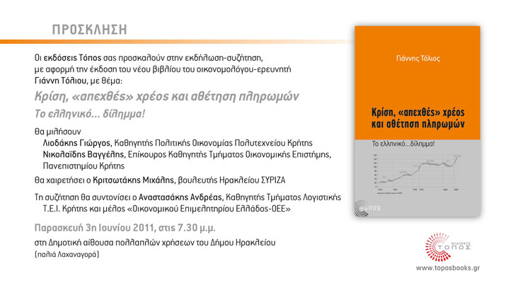 ::. "Κρίση, "απεχθές" χρέος και αθέτηση πληρωμών"-Παρουσίαση του βιβλίου του Γ. Τόλιου στην Κρήτη (30-05-2011 11:46)