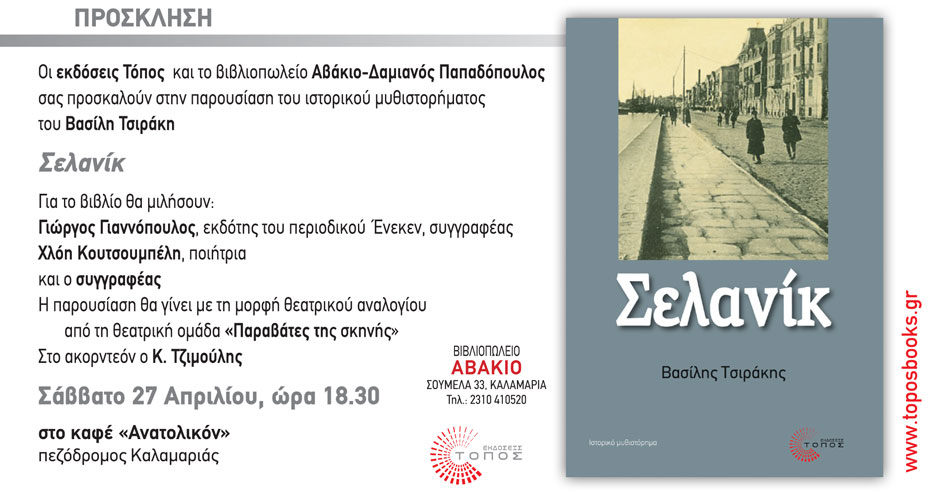 ::. "Σελανίκ"- Παρουσίαση του μυθιστορήματος του Βασίλη Τσιράκη στη Θεσσαλονίκη (Σάββατο 27 Απριλίου) (25-04-2013 11:33)
