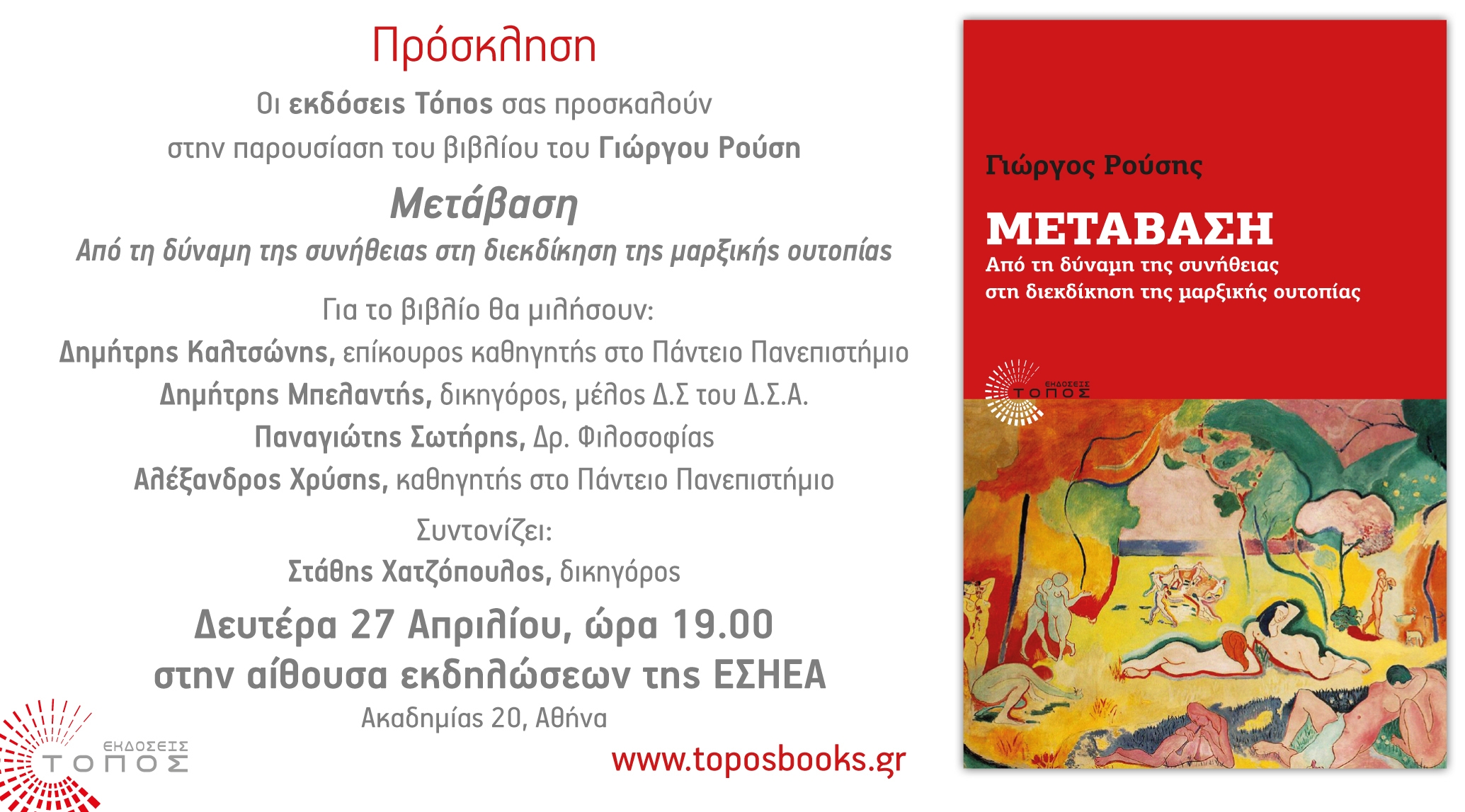 ::. ''Μετάβαση: από τη δύναμη της συνήθειας στη διεκδίκηση της μαρξικής ουτοπίας'': Παρουσίαση του βιβλίου του Γιώργου Ρούση την Δευτέρα 27 Απριλίου στην ΕΣΗΕΑ (20-04-2015 14:33)