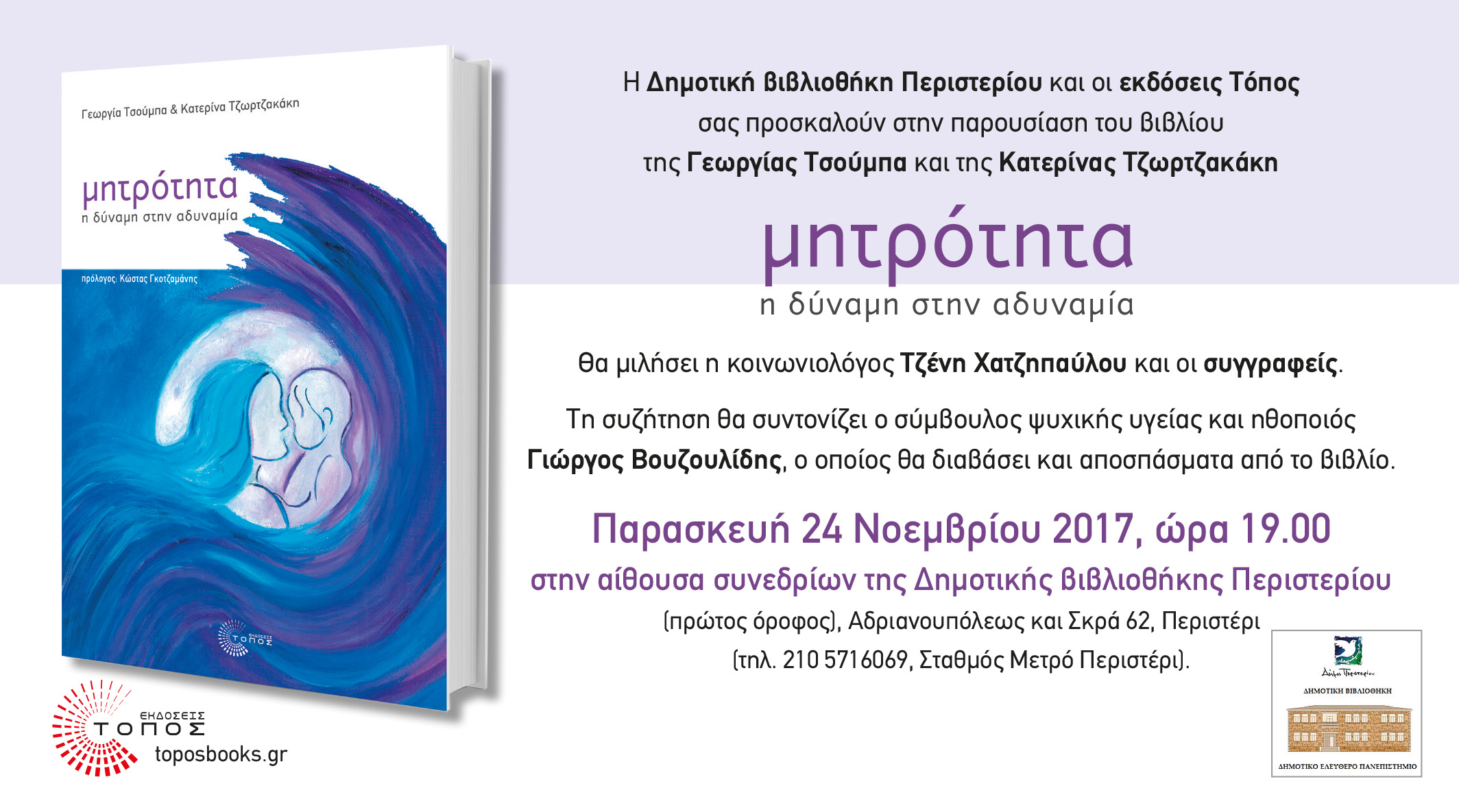 ::. Παρασκευή 24 Νοεμβρίου: ''Μητρότητα, η δύναμη στην αδυναμία'' παρουσίαση του βιβλίου των Γ. Τσούμπα & Κ. Τζωρτζακάκη στη Δημοτική Βιβλιοθήκη Περιστερίου (22-11-2017 10:53)