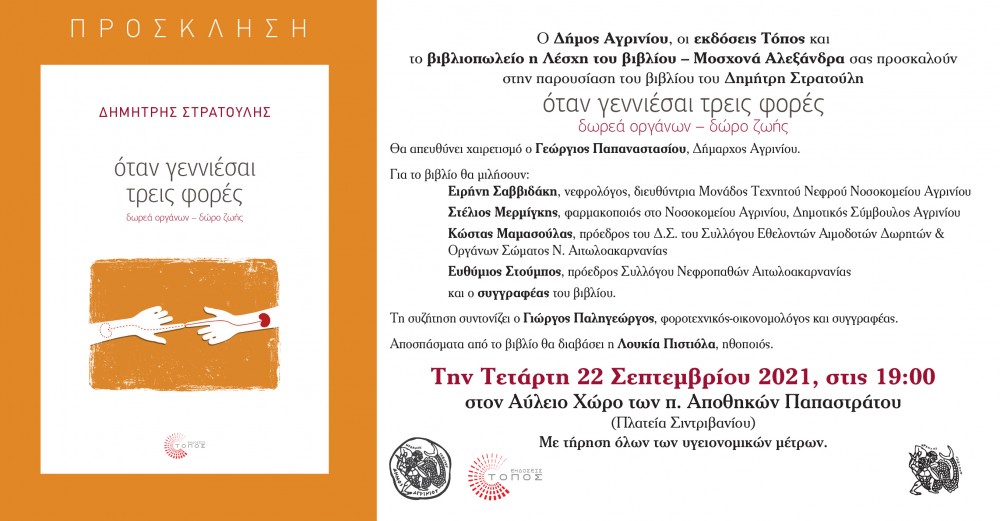 ::. Τετάρτη 22 Σεπτεμβρίου:''Όταν γεννιέσσαι τρεις φορές'' παρουσίαση του βιβλίου του Δημήτρη Στρατούλη στο Αγρίνιο (21-09-2021 15:27)