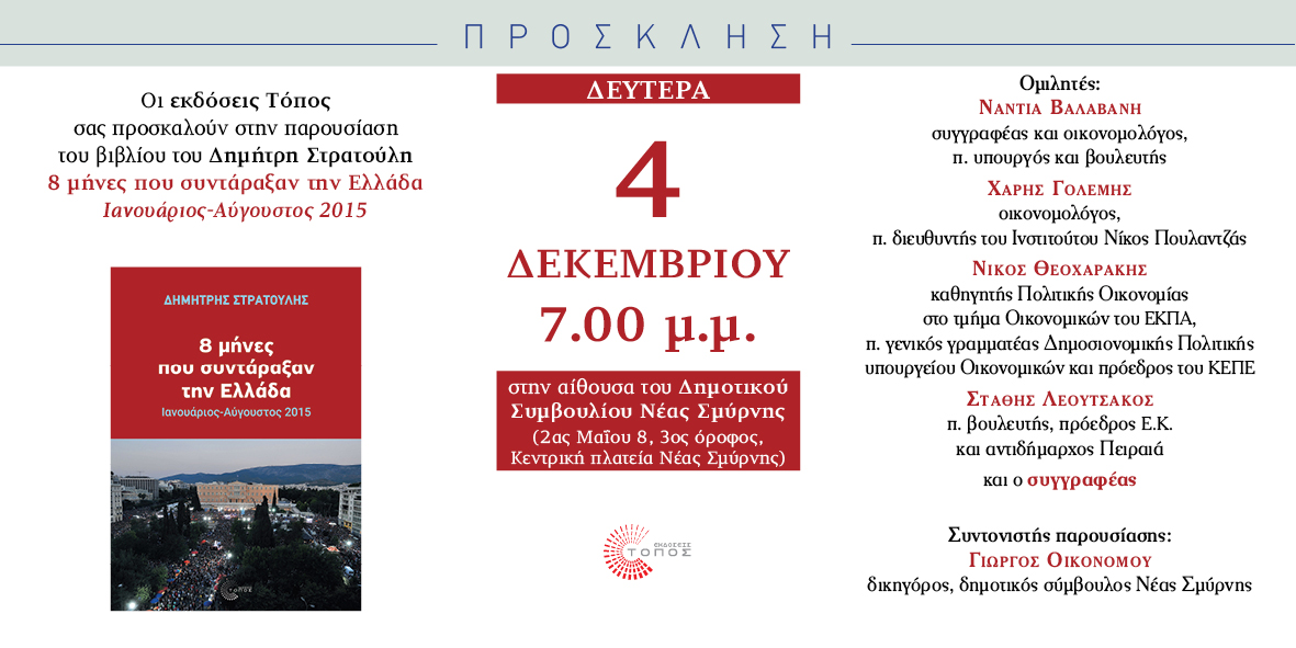 ::. Δευτέρα 4 Δεκεμβρίου: ''8 μήνες που συντάραξαν την Ελλάδα'' παρουσίαση του βιβλίου του Δημήτρη Στρατούλη στη Νέα Σμύρνη (21-11-2023 17:15)
