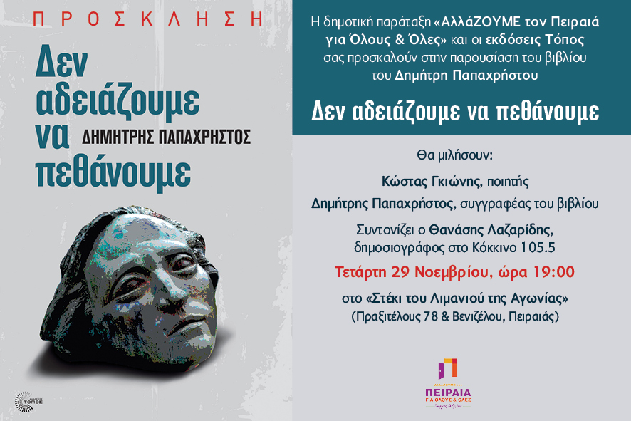 ::. Τετάρτη 29 Νοεμβρίου: ''Δεν αδειάζουμε να πεθάνουμε'' παρουσίαση του νέο βιβλίου του Δημήτρη Παπαχρήστου στον Πειραιά (24-11-2023 18:20)